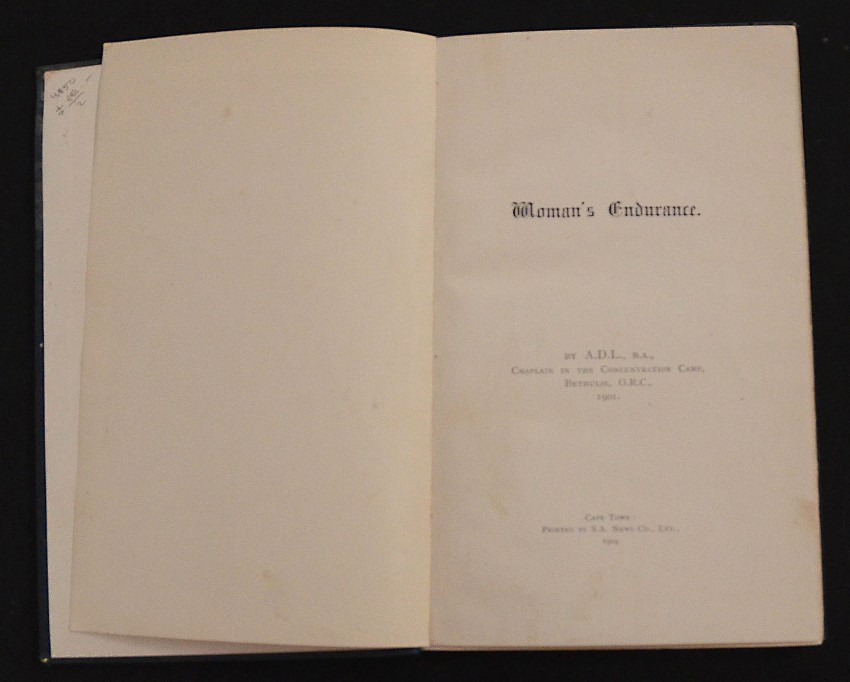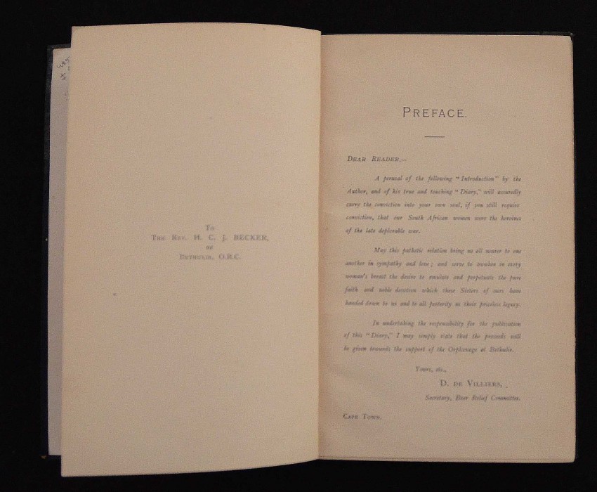 A very scarce book and one of the earliest accounts of the Boer War Concentration Camps. In the form of the diary of the Chaplain of the Bethulie Concentration Camp. A slim volume of 67pp. in the original cloth with the title embossed on the front cover. SABIB Vol. 3, pp. 178.