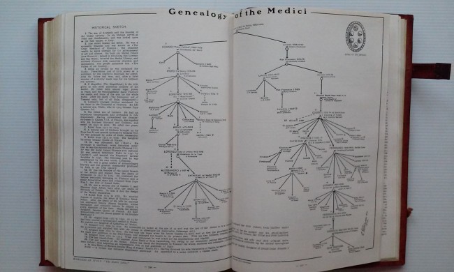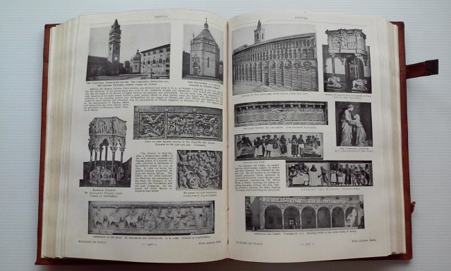 The object of this book is to facilitate the traveller's itinerary in Italy, by indicating at a glance the most notable places and works of art in the cities through which he travels... areas listed include Piedmont, Liguria, Lombardy, Venetia, Emilia, Tuscany, Umbria, Latium, Campania, Abruzzi-Apulia, Sardinia, and Sicily; and the appendix includes genealogical charts of the nobilities of Milan, Mantua, Urbino, Valois-Orleans, Kings of Naples, and the Medicis; 623pp. beautifully bound in full leather with metal clasps, raised bands bound in to both front and back boards, blind stamping with fleur-de-lis motif. All illustrations and photographs in black and white.