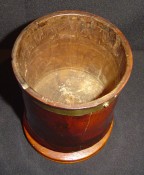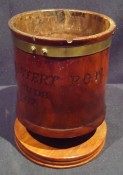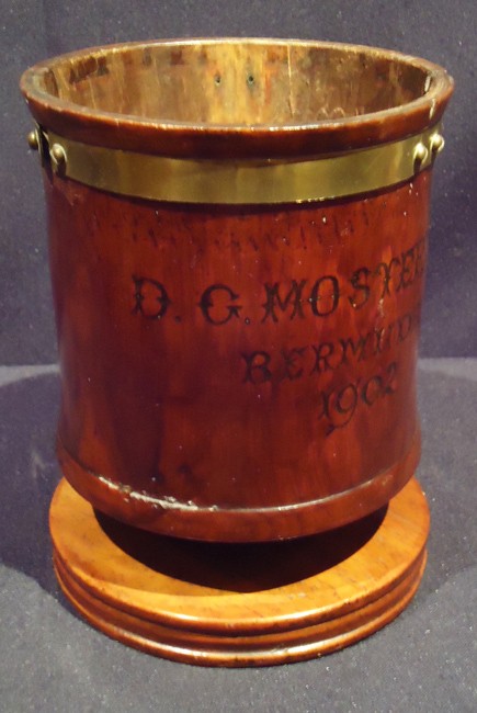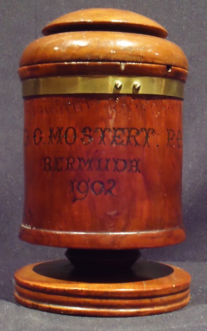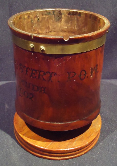 215 mm high by 120 mm in diameter, with a brass strip below the lip secured with five screws (one is missing). Carved and highlighted in black around the barrel – D.G. Mostert. P.O.W. Bermuda 1902.