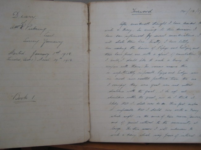 Only a little more than half the book comprises actual diary, as the first 98 pages are filled with a “foreword”, started on 14 December 1917 and discussing diary-writing in general, quoting from the famous, including Pepys and Evelyn, and explaining no doubt to a family member why this 23-year-old officer had decided to write a diary.