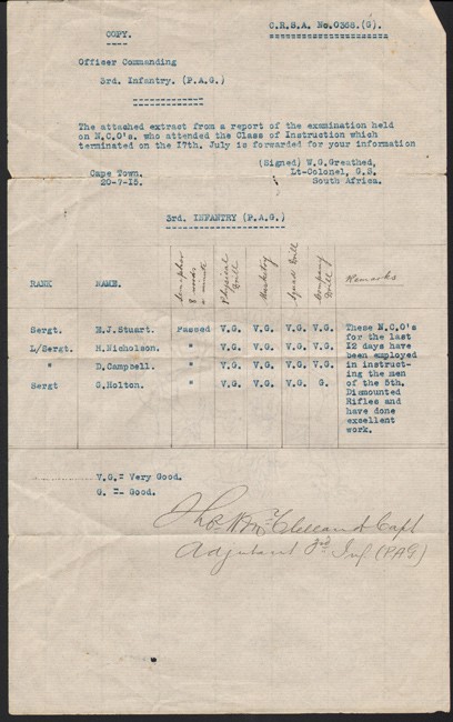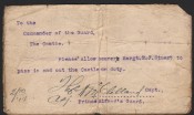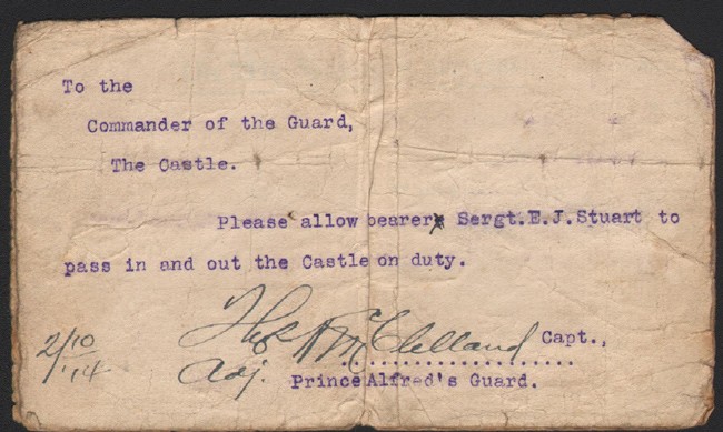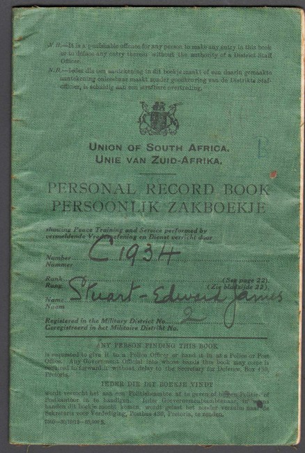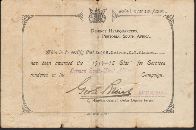 Included are his Personal Record Book (C1934), Certificate of Service, Mobilization Order (1914), Pass to allow Sergt. E.J. Stuart to pass in and out of the Castle, Cape Town, Certificate awarding No. 196. Driver C.J. Stuart the “1914 -1915 Star” for services rendered in the German South West African Campaign, Volunteer Discharge Certificate.
