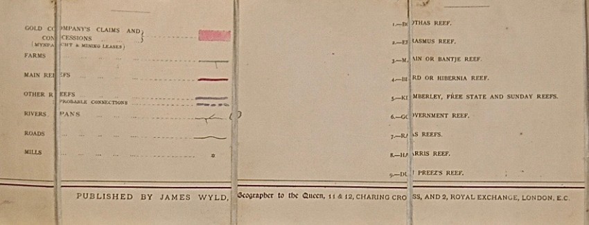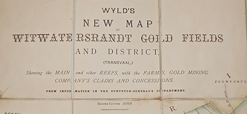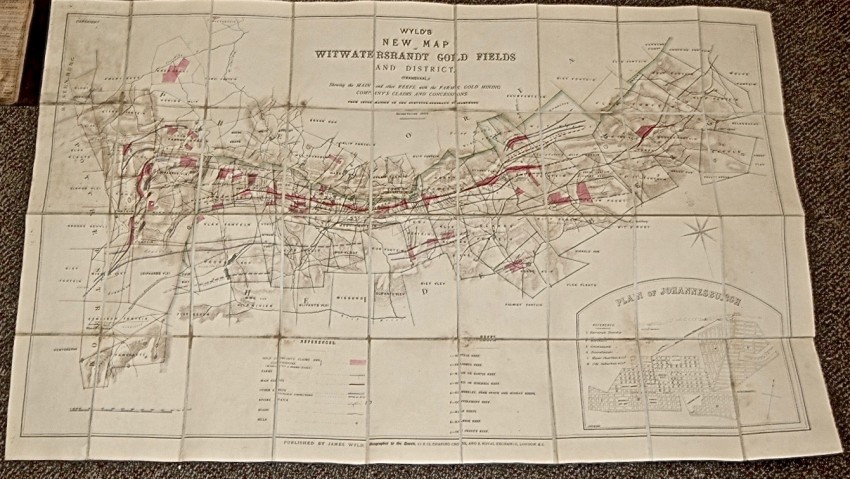 One of the first maps of the newly developed gold fields. Measures 103 cm x 60 cm, 36 folding panels mounted on linen, vividly coloured. In a somewhat worn brown cloth case. A scarce map of the new gold fields, first discovered in 1886, by the mapmakers under James Wyld (1812-87), one of the world's leading mapmakers and Geographer to the Queen. Bright and sound. Scarce.