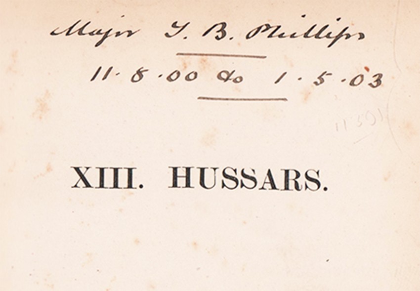 Signed at the top of the title page by Major T.B. Phillips 11.8.00 to 1.5.03 who is listed a commanding B Squadron of the Reserve Squadron as Captain Phillips as it left Aldershot in November 1899.