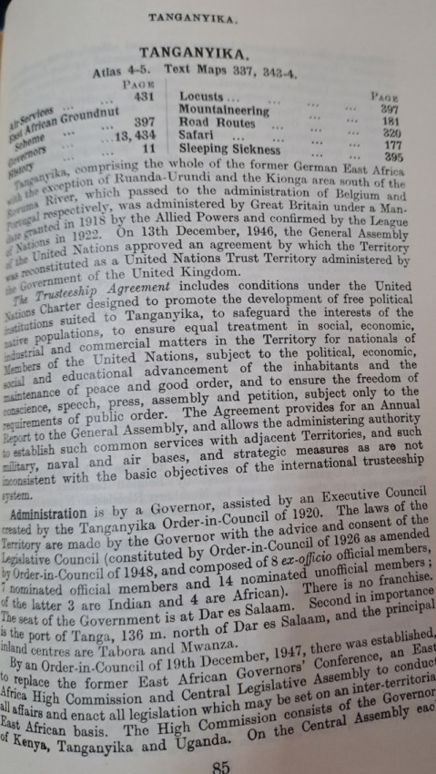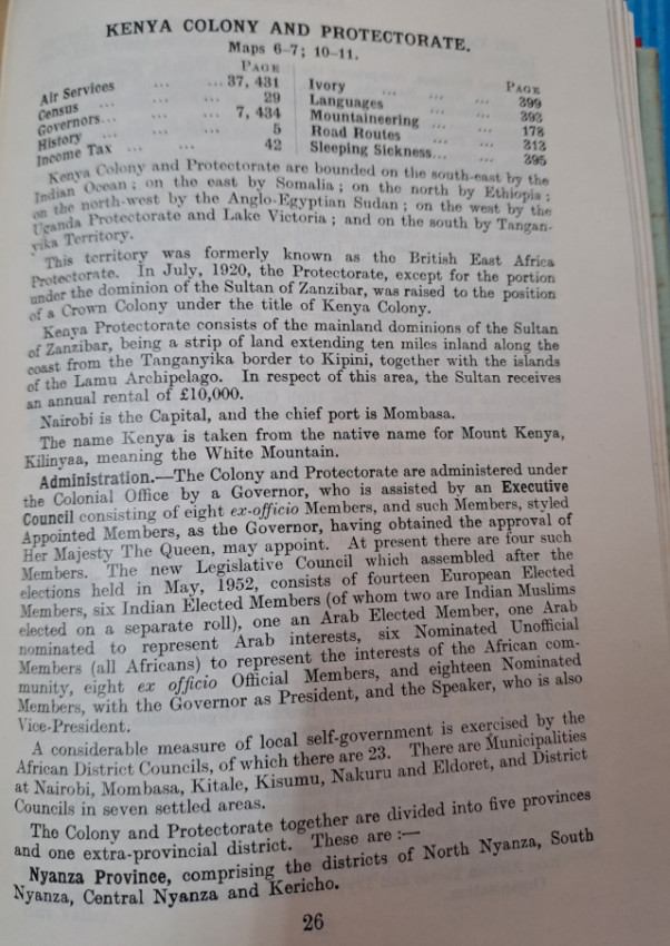 Full colour undamaged colour map enclosed in front pocket of pastedown. Colour atlas of Tanganyika, (Western and Eastern sections) Kenya, Uganda and Surrounding Territory, Kenya Colony . Kenya Colony (Central) and Lake Victoria (Enlarged scale) . Abyssinia and The Sudan. Mozambique. Nyasaland Protectorate.