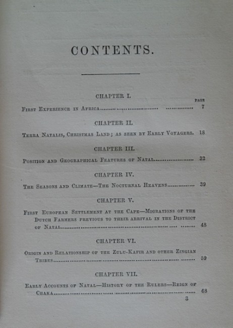 Contents: First experience in Africa; Terra Natalis, Christmas Land as seen by early voyagers; Position and geographical features of Natal; The seasons and climate - The nocturnal heavens; First European settlement at the Cape; Origin and relationship of the Zulu-K.... and other Zingian tribes; Early accounts of Natal - history of the rulers - reign of Chaka; What the Dutch did and suffered in Natal, and how the district became a British Colony; Appearance and pursuits of the Natives; Zulu-k.... law and government, their influence upon the native mind; Superstitions views and practices of the people, wizards, priests and doctors; Matrimonial affairs in Zulu-land; Character, moulding agencies, bent and capacities of the native mind; Zulu language and literature; History of the American Mission from 1834 to 1843; History of the American Mission from 1843 to 1862; History of the Inland American Mission, to Umzilikazi and his people, at Mosiga; European Missions to Zulu-land; The geological features of Natal; Botanical productions; The fauna of Natal - beasts; Reptiles; Insects and Birds; European enterprise in Natal; Present state of affairs in Zulu-land.
