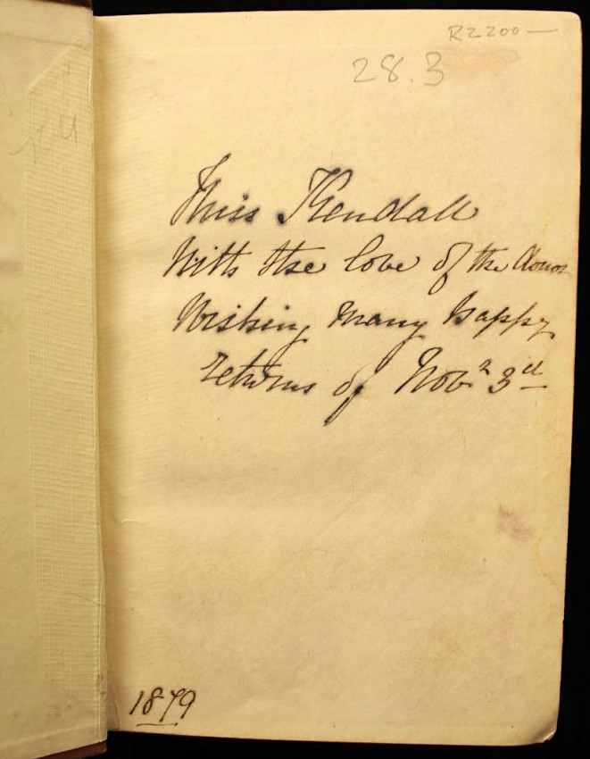 Possible author's presentation inscription on front endpaper, dated 1879.