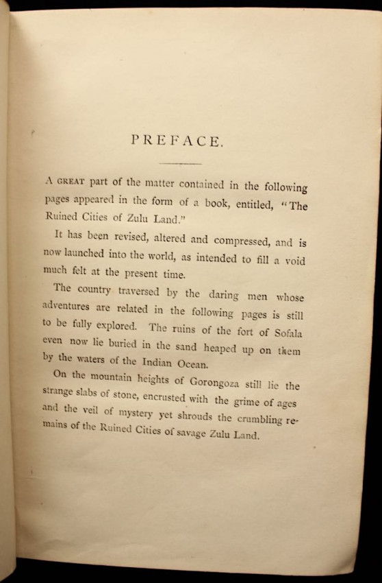 'A great part of the matter contained in this work is taken from "The Ruined Cities of Zulu Land," which was "reviewed, altered, and compressed" to meet the purposes of this edition.' - Mendelssohn Vol.II, page 581