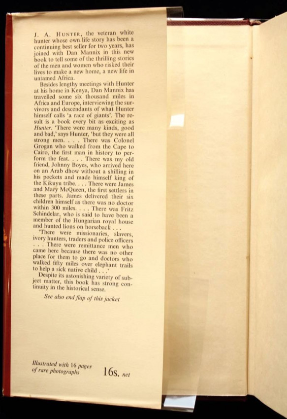 'J. A. Hunter, the veteran white hunter whose own life story has been a continuing best seller for two years, has joined with Dan Mannix in this new book to tell some of the thrilling stories of the men and women who risked their lives to make a new home, a new life in untamed Africa.'