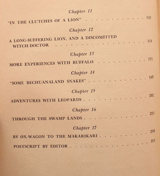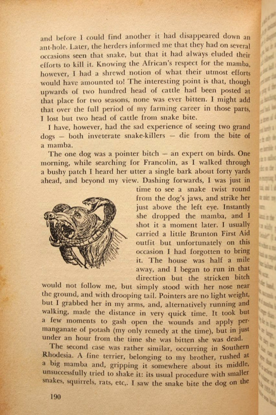 His account of his mauling by a lion is one of the most vivid chapters in the book, whilst he has much to say about the snakes of his part of the world.