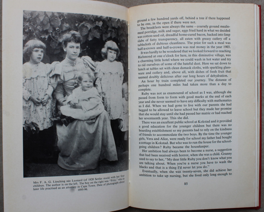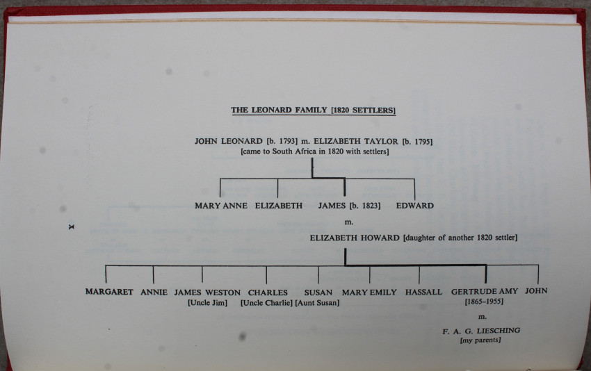 Her great-great-grandfather Dr Liesching, came to South Africa as surgeon to the Wurtemburg Regiment in 1787. Her father fought in the Gaika-Galeka war in the 1870's and played a part in the Jameson Raid. He was taken prisoner at Doornkop, but later released through the good offices of Commandant-General Piet Joubert.