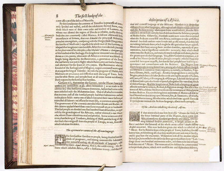 Written in Arabicke and Italian by Iohn Leo a More, borne in Granada, and brought up in Barbarie. Wherein he hath at large described, not onely the qualities, situations, and true distances of the regions, cities, townes, mountaines, riuers, and other places throughout all the north and principall partes of Africa; but also the descents and families of their kings, the causes and events of their warres, with their manners, customes, religions, and civile government, and many other memorable matters gathered partly out of his owne diligent obseruations, and partly out of the ancient records and Chronicles of the Arabians and Mores. Before which, out of the best ancient and moderne writers, is prefixed a generall description of Africa, and also a particular treatise of all the maine lands and isles vndescribed by Iohn Leo.