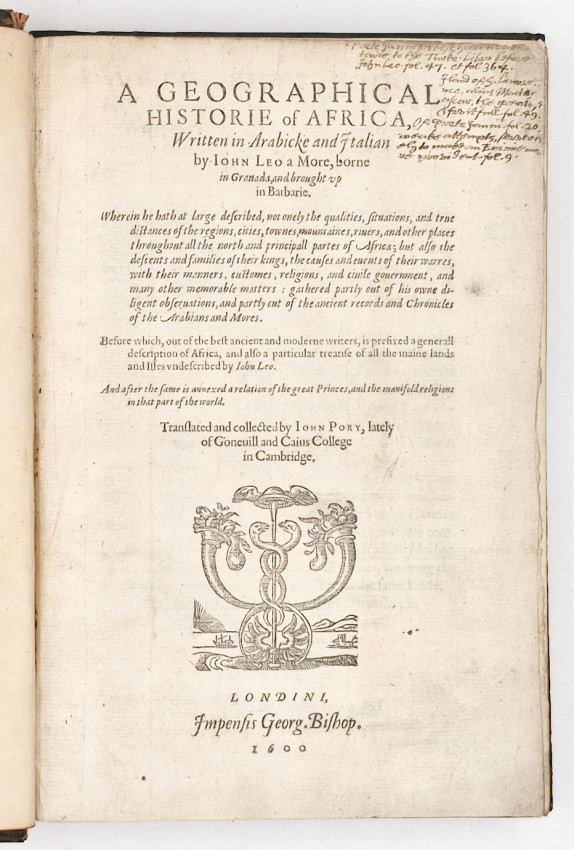 Shakespeare's Othello and Leo Africanus: Since this first English translation of A Geographical Historie Of Africa was published in London in 1600 Shakespeare likely encountered Leo's description of Africa through the translation by John Pory, which provided a European audience with a first hand, though sometimes problematic, accounts of African geography, culture, and people. Scholars believe aspects of Leo's descriptions of African character traits, presented in his work, were adapted by Shakespeare to shape Othello's characterisation when he wrote the play in 1603.