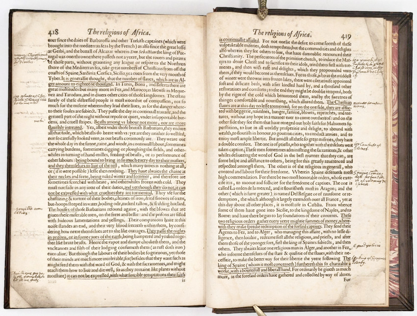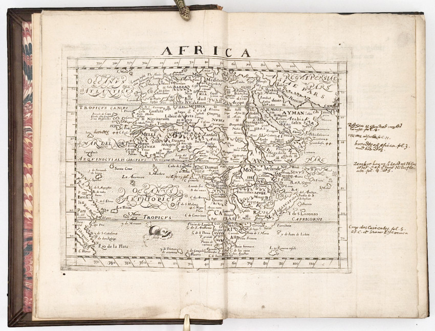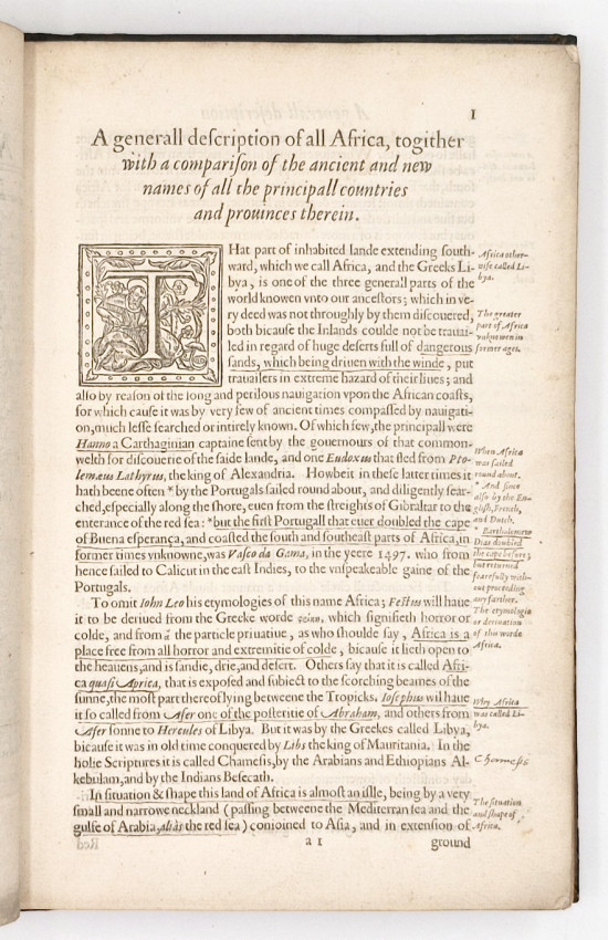 First Edition in English: (xviii), 60, 420 pages, fine double page map of Africa mounted on a stub, many large woodcut ornamental initials, paper flaw in the lower corner of leaf 9/10, and the lower corner of the last leaf of text neatly repaired, otherwise the contents are clean and fresh. Marginalia and underlining throughout all by the original owner who carefully annotated the text and added a four page table of contents at the end locating the subjects of particular interest to him, with a date and purchase note. Also a note in the same hand at the top of the title page. Bound in 19th century olive calf preserving the original backstrip, both covers with a blind-stamped central medallion bearing the armorial device of Sir William Stirling-Maxwell (1818-1878), marbled endpapers, all edges gilt. Circular book plate of Stirling-Maxwell on the front paste-down endpaper, a very good copy.