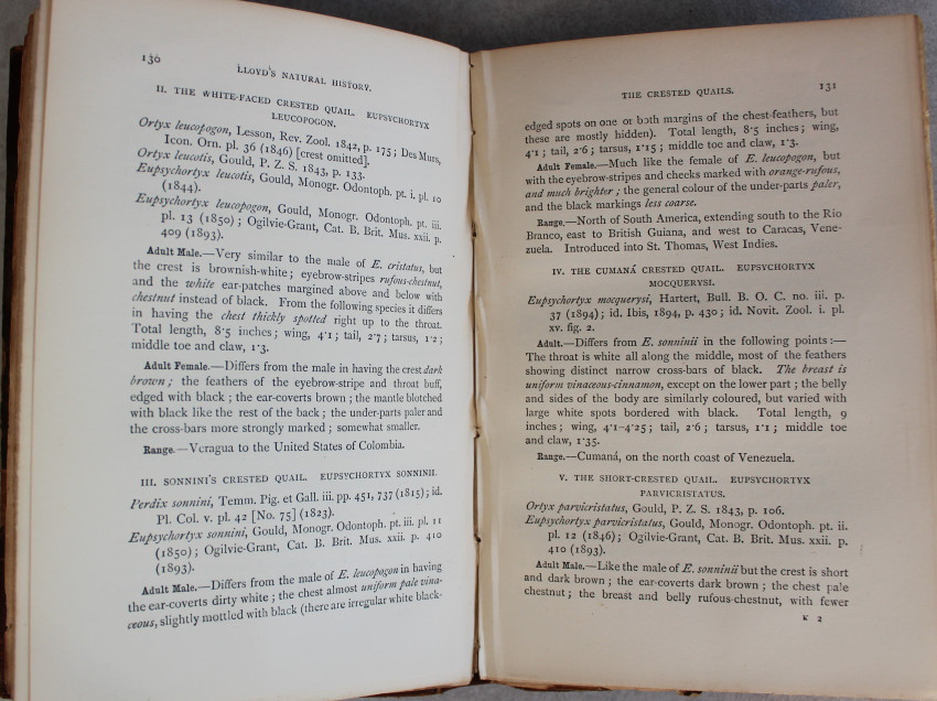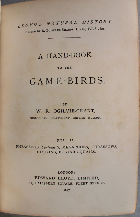 A good pair of first editions of W. R. Ogilvie-Grant's study of game-birds, illustrated with numerous bright chromolithographs. First editions. Complete in two volumes. Published as part of Lloyd's Natural History collection.