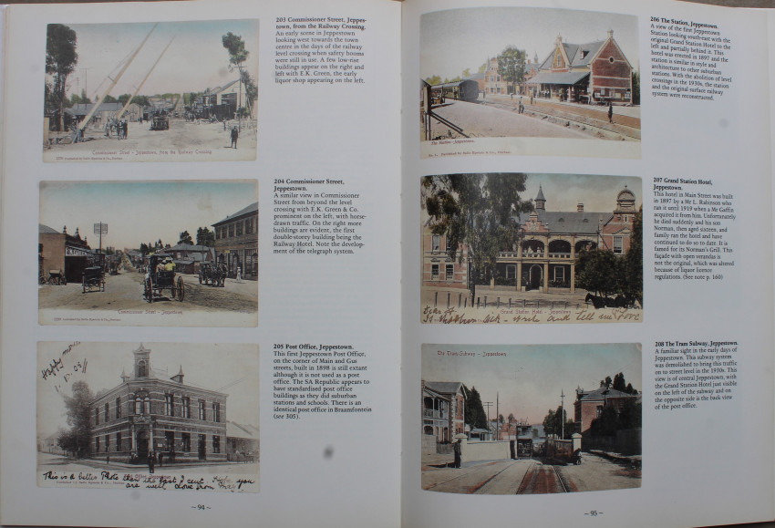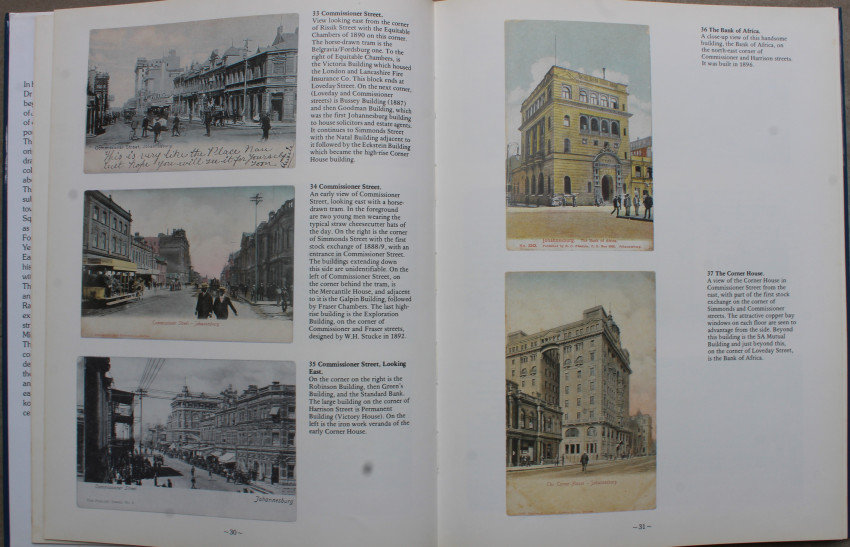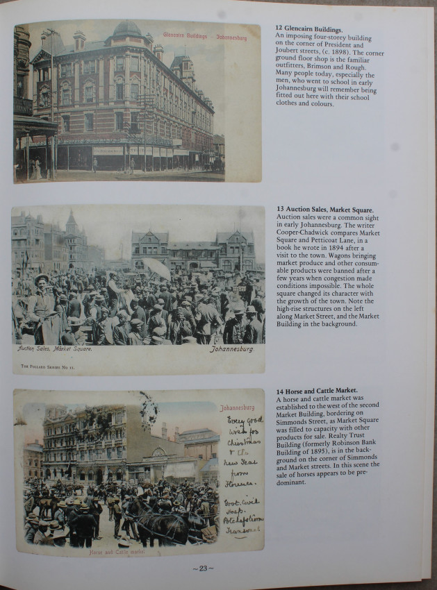 ”... A Johannesburg Album... traces the beginnings and early development of Johannesburg’s suburbs in a series of over 325 historical picture postcards, most of them in colour... The book describes the earliest suburbs and areas of the mining town, beginning with the Market Square and including suburbs such as Doornfontein, Jeppestown, Fordsburg, Parktown, Saxonwold, Yeoville, Berea and Braamfontein... There are also chapters on Crises and Events, including the Jameson Raid, the Braamfontein dynamite explosion and the 1913 miners’ strike; Chinese on the Mines and Mining...”.