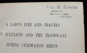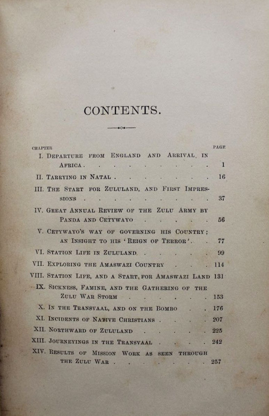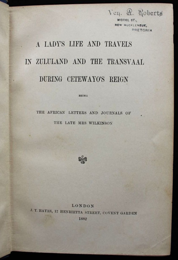 'The letters composing this memoir are published with a view to giving an idea of the kind of life which a lady is called upon to live when she leaves her English home for the purpose of aiding " . . . missionary work "in such a wild and savage country as Zululand." Mrs. Wilkinson accompanied her husband, together with his missionary party, to Zululand, sailing from Falmouth on July 6, 1870. They made some stay at Bishopscourt near Cape Town, afterwards proceeding to Maritzburg, Natal, and it is stated that on their arrival at this town they found that "everybody that can go is gone to the diamond fields." The road to their destination - the mission station of Kwamagwaza - was by the lower Tugela Drift to Ekowe (Etoywe), and en route the missionaries visited many well-known people in Natal, connected with mission and religious work in the colony. The volume affords considerable information respecting social and political life among the colonists and natives of Natal and Zululand at this period, and includes a few details regarding the author's travelling experiences in the Transvaal. Mrs. Wilkinson appears to have been much liked by the natives, but she does not speak well of Cetywayo, and observes, "From the day of his coronation . . . to the day our troops entered his country, his attitude towards us was one of broken faith, marked disrespect, and increasing insolence." Bishop Wilkinson and his wife visited England in 1875 in order to make arrangements for the extension of the diocese and raise the necessary funds, but towards the end of the year 1877 Mrs. Wilkinson was attacked by consumption and succumbed. The station at Kwamagwaza had become a most important centre in the very middle of Zululand and its progress had been remarkable under Bishop Wilkinson, but during the war with Cetywayo it was destroyed and all the buildings demolished . . ." - Mendelssohn Vol.II, page 610-11