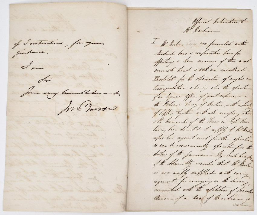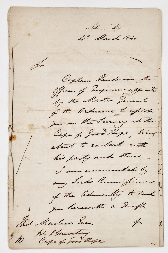 I. Mr. Maclear being now furnished with standard bars & compensation bars for effecting a base measure of the most accurate kind & with an excellent Theodolite for the observation of angles in triangulation & having also the assistance of an Engineer Officer of great experience in the Ordnance Survey of Britain, with a party of Sappers together with all necessary stores & the Commander of the Forces in Cape Town having been directed to supply to Mr. Maclear upon his request such further assistance as can be conveniently spared from the duties of the Garrison — His Lords Commissioners of the Admiralty consider that Mr. Maclear is now amply supplied with every requisite for carrying on the survey connected with the repetition of Lacaille's Measure of an Arc of Meridian contemplated in the Xth Article of the Instructions transmitted by Their Lordships to Mr Maclear on the occasion of sending Bradley's Sector to the Cape of Good Hope & they desire therefore that Mr Maclear will proceed as soon as practicable to the execution of that Survey.