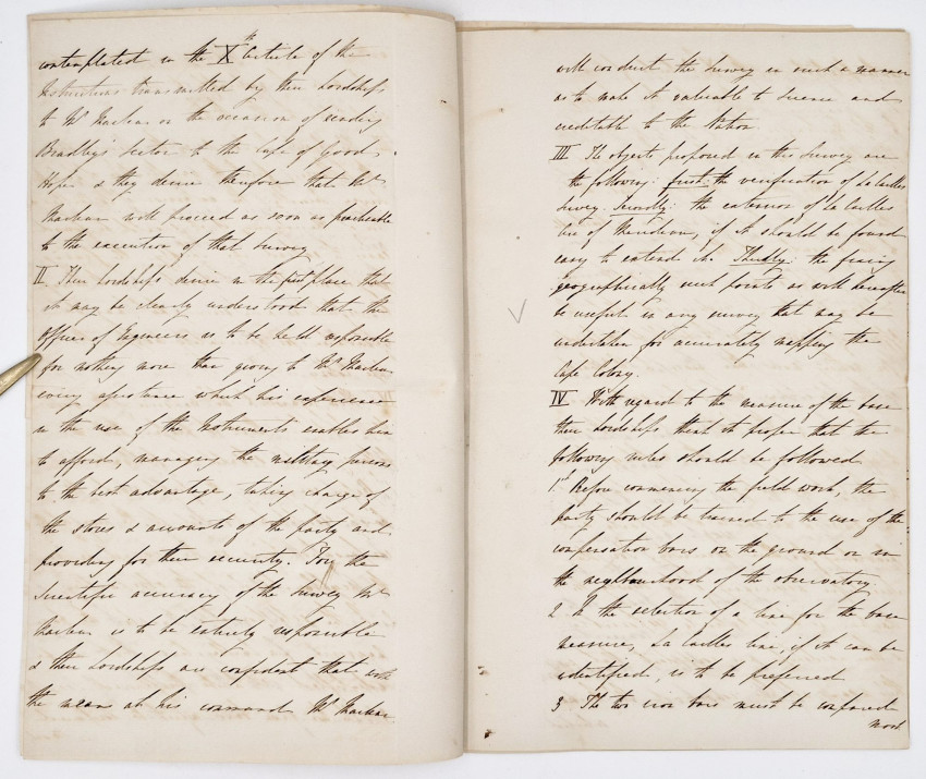 IX. It will be Mr. Maclear's duty as early as possible to transmit to the Secretary of the Admiralty a complete copy of the observations of every kind made on the survey &, as soon as the reduction of the observations shall be terminated, to transmit to the Secretary a full statement of the results obtained & the method by which they have been obtained.