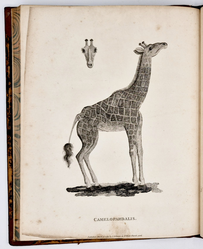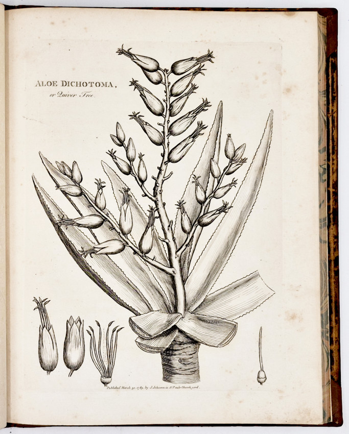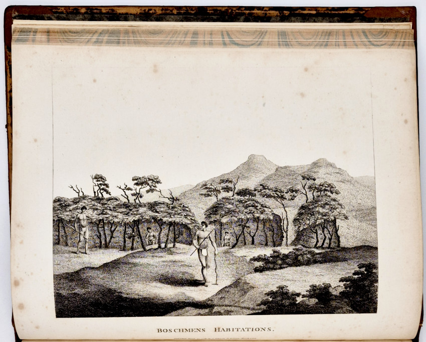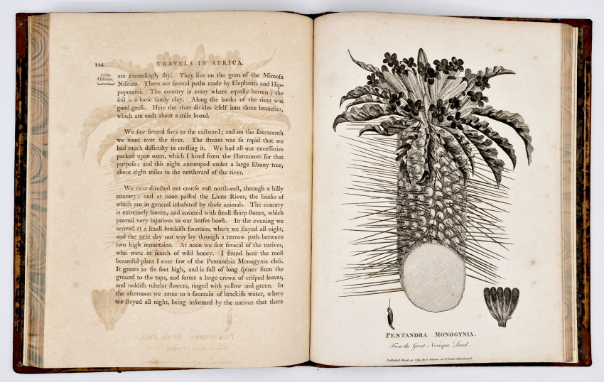 First edition: vi, [ix]-xii, 171 pages followed by iii index, (i) errata and directions of placing of the plates, 17 engraved plates (14 of botanical subjects, 1 of a Camelopardalis (Giraffe) and two of Bushmen habitations and Hottentots), folding map at the end, contemporary full diced calf rebacked and with a leather title gilt title label, bottom corner of the front board damaged, marbled edges and endpapers, two bookplates on the front endpapers, light foxing and offsetting of the plates, a very good copy.