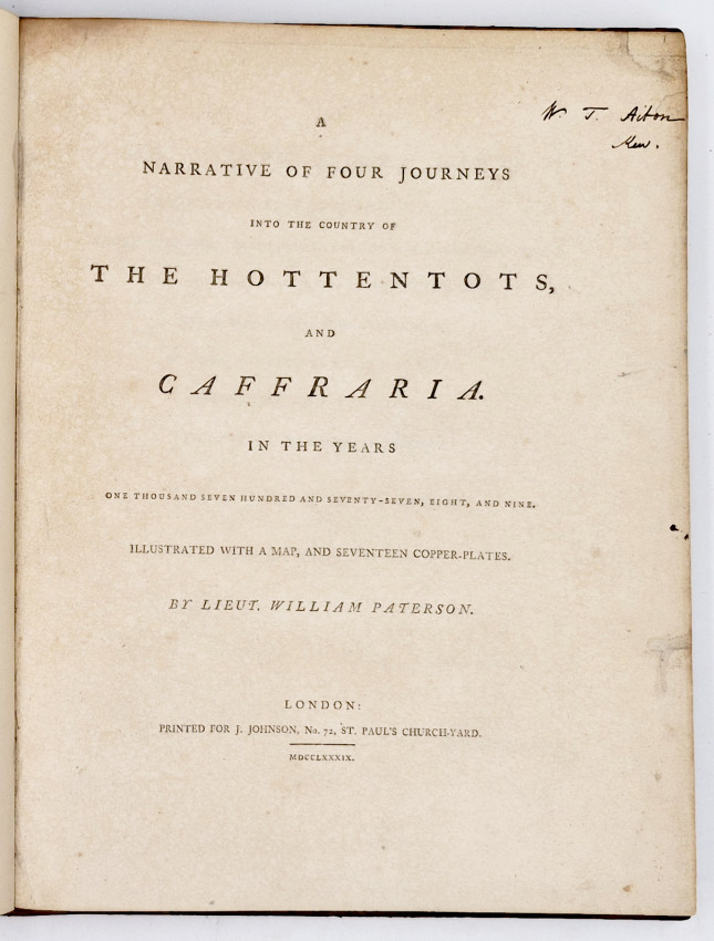 'Paterson published ‘A Narrative of Four Journeys into the Country of the Hottentots and Caffraria in the years 1777–8–9,’ London, 1789, 4to. A second edition and a French translation appeared in 1790. His botanical collections are in the Natural History Museum at South Kensington.' [http://en.wikisource.org/wiki/Paterson,_William_(1755-1810)_(DNB00)]
