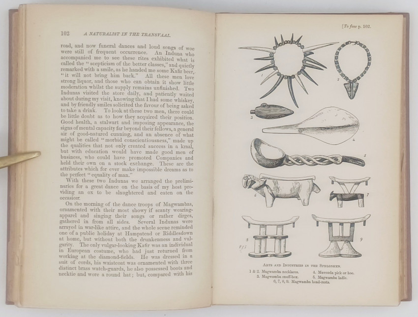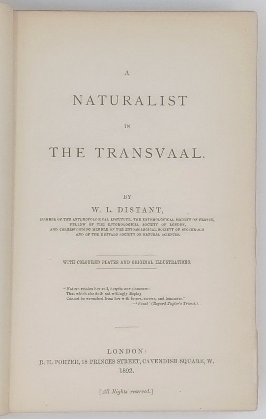 Mendelssohn (Sidney) South African Bibliography, volume 1, page 471-2. "The impressions of a naturalist who, during a twelve months' business sojourn in the Transvaal ... employed the whole of his leisure ... in zoological recreation..."