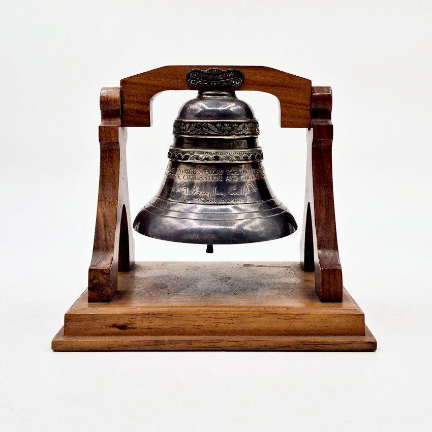 The stand of this replica, has a movable horizontal bar which enables the bell to be rung and is made of Rhodesian mukwa (often called Rhodesian Teak or Bloodwood). The leather case bears the Rhodesia Coat of Arms, awarded to Rhodesia in 1924 by Royal Warrant and the entire piece is made under the auspices of Scottish Jewellers (Private) Limited in Salisbury.