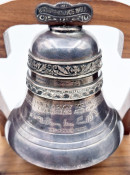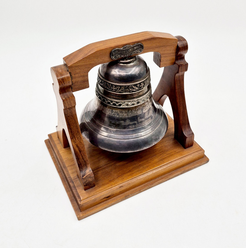 The bell is 10 cms in height and 11.5 cms in width with a silver clapper and is hallmarked along the rim. The wooden frame is 18cms in height.