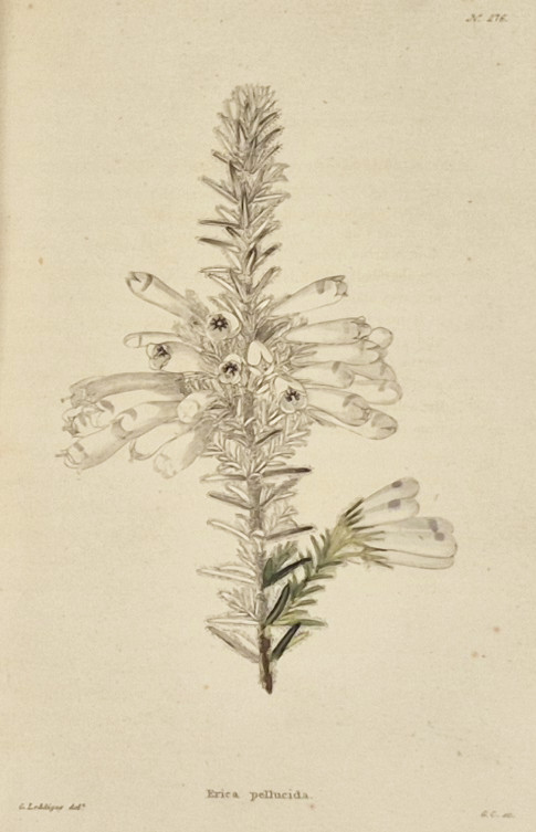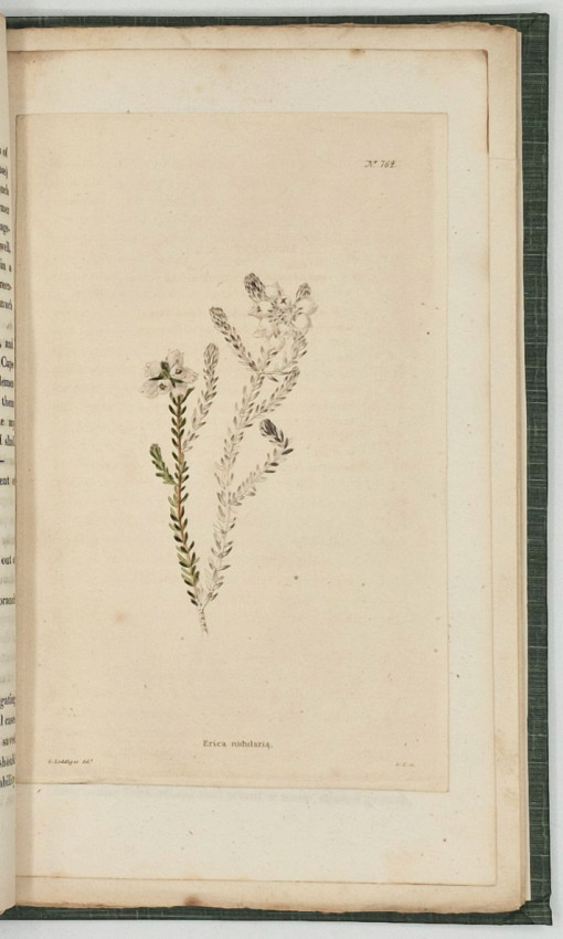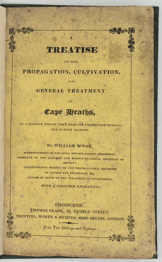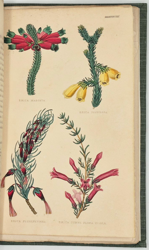 43 pages, hand coloured engraved frontispiece of Erica Aristata, original printed yellow paper wrappers bound in green cloth. Extra illustrated with 6 hand coloured engravings of Ericas five of which are by G. Loddiges from his Botanical Cabinet and another with four hand coloured engravings of Ericas from another publication, a very good copy.