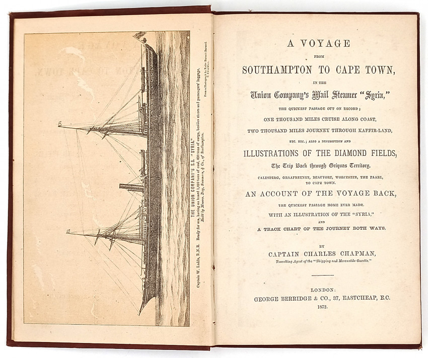 Mendelssohn (Sydney) South African Bibliography, volume 1, pages 320/1, ‘A curious little volume, written throughout in the second person. The author left England on May 25, 1871, in the S.S. Syria, and arrived in Table Bay on the 21st of June, which constituted a record for the outward passage, and there is a short account of Cape Town and other southern ports, and of the Cape Colony and Natal. The most interesting part of the work, however, is the description of the diamond fields, and the journey up country. Captain Chapman took the East London route, via King William's Town, Burghersdorp, and Fauresmith, and a short stay being made at Jagersfontein, he gives a few details regarding that mine at a period when “you could get a claim for about a pound a month.” En route to the Griqualand West diamond fields, the traveller stopped at a Dutch farmer's tent, and there is a quaint description of the beauties of the farmer's daughter. Although written in a homely chatty style, much information is afforded in this little book, and the description of Dutoitspan “in the early days” is both graphic and animated. Kimberley appears to have been unknown under that name, but the “New Rush” and De Beers' were fully recognised as wealthy mines, and there is a “digger's page” respecting the latter mine, which gives the names of the old pioneers. The place is depicted as in a hubbub of excitement, and the population is stated to have amounted to 50,000 people, an estimate which probably included the River diggings. It would appear, however, that claims could still be bought at extremely low prices, in spite of the wonderful finds of the diggers. Among other interesting items is the story of the robbery of the “New Rush” post-office, and it would seem that, despite the valuable nature of the mail, the post-office was not only not guarded, but even the windows were not secured, and the thief had merely to put his hand through, take “the packet which seemed the heaviest,” and calmly walk away. Mention is made of the sales of diamonds by auction at Port Elizabeth, which appeared to be the method of disposal adopted by the local firms. It is recorded that, during part of a month, 23,449 carats were offered for sale, and it is interesting to note that the diamonds averaged over two carats each in weight.’
