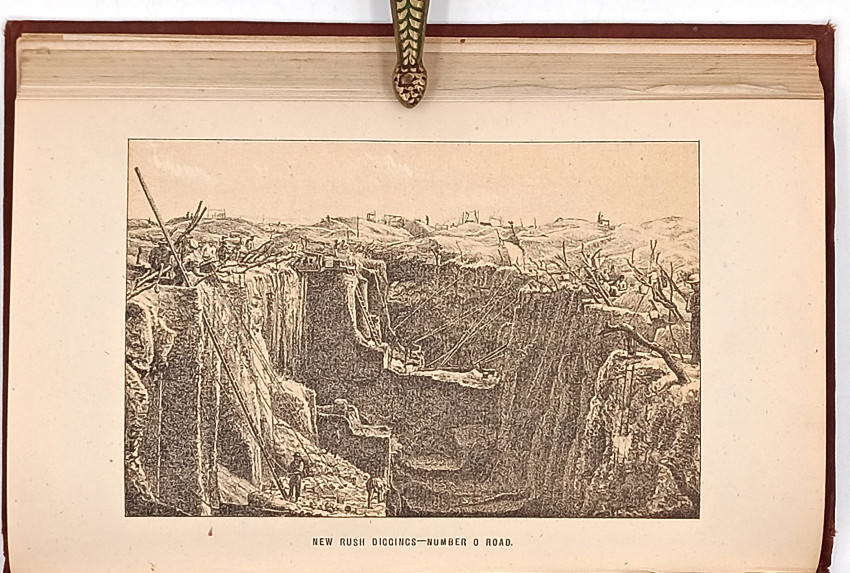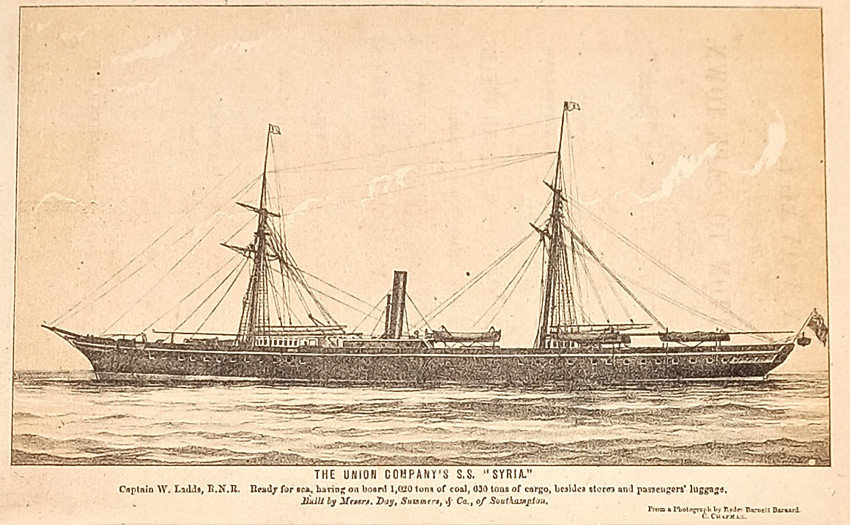 First Edition: 218 pages and several pages of commercial advertisements at the front and back, tinted lithographic frontispiece of The Union Company’s S.S. “Syria,” 3 tinted lithographic plates, chart of the voyage out and home showing the daily runs, original brown cloth decorated in blind on both covers and titled gilt on the upper covers, original yellow endpapers (book plate on the front free endpaper), a very good copy.