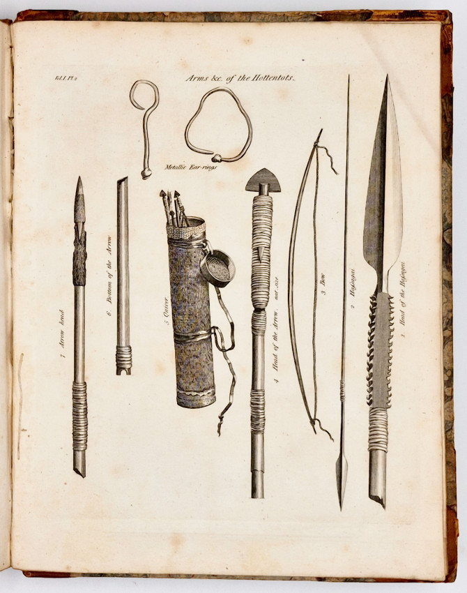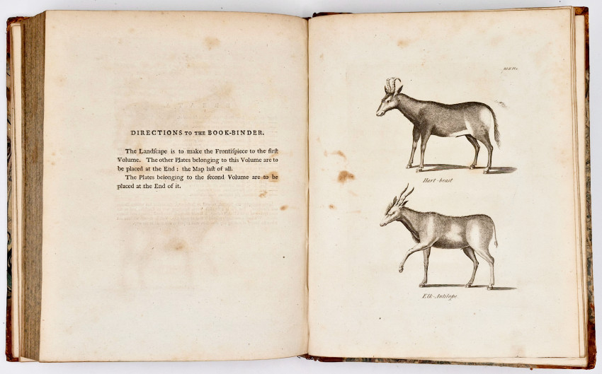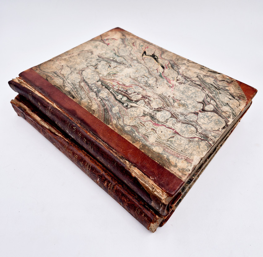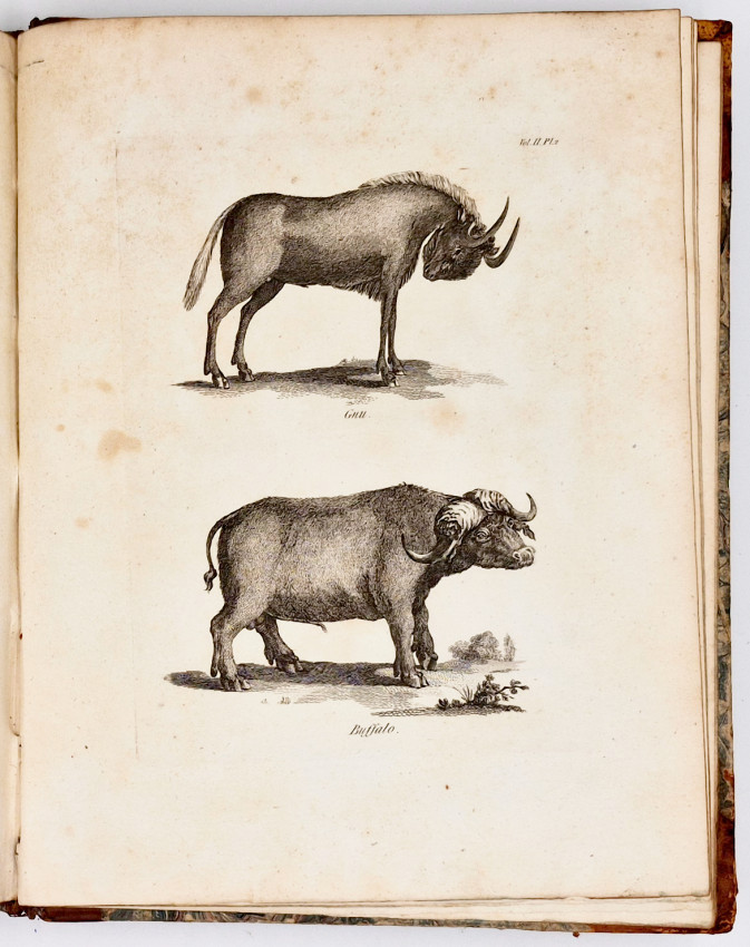 First English Edition: 2 volumes: I. xxviii, 368 II, viii, 354, (ii errata and directions to the book-binder), pages, copper engraved frontispiece in volume 1, 9 engraved plates bound at the end of each volume, old half leather with marbled paper sides very worn and splitting along the spines but holding firmly on the ties, some of the plates are slightly foxed, contents are free of foxing, a good copy.
