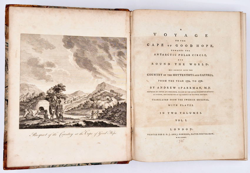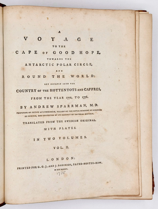 From A South African Bibliography, Volume 4, page 362: ‘British Museum and Library of Congress give the translator as Georg Forster, but according to Professor Forbes in his edition of Sparrman' s Voyages published in 1975-77 (Van Riebeeck Society), the translator was probably Charles Rivington Hopson.