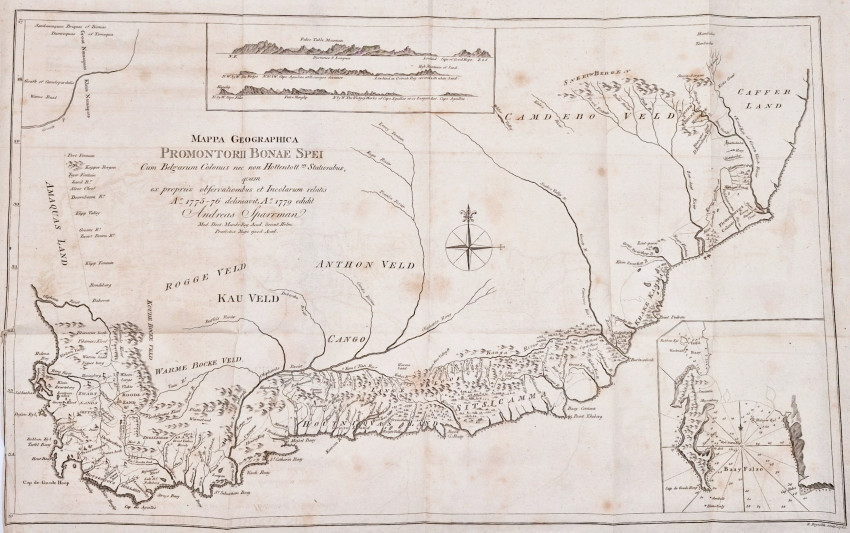 ‘Sparrman's most important publication, which included many of the descriptions referred to above, was his Resa till Goda Hopps-Udden... (1783), translated into English as A voyage to the Cape of Good Hope, towards the Antarctic polar circle, and round the world; but chiefly into the country of the Hottentots and Caffres, from the year 1772, to 1776 (London, 1785, 2 vols). A reprint of the English edition, with introduction and explanatory notes by V. Forbes, was published by the Van Riebeeck Society in 1975-1977. It was the first personal account of extensive travels in the settled parts of the Cape of Good Hope and provided the first accurate account of the territory and its natural history. Sparrman made some interesting observations relating to agriculture and stock farming, on the effects of veld burning and overgrazing, the spread of rhenosterbos, the lack of manuring and decline in soil fertility, and the advantages of mixed farming. The book also included valuable geographical and ethnographical material and a map of the colony that was issued separately in 1779. This map (latitude scale c. 1:2 790 000), though crude and inaccurate, was the first to be printed that showed in some detail the extent of settlement at the time and contained the names of many identifiable places in the interior. It has been described as "a milestone in the history of South African cartography" (Forbes, 1975, p. 9) and was only superseded by the greatly superior map of J. Barrow in 1801.