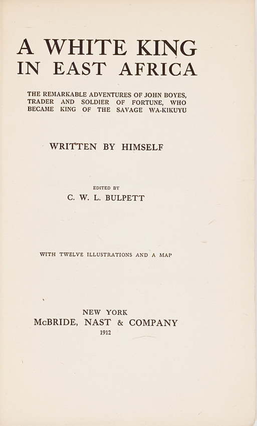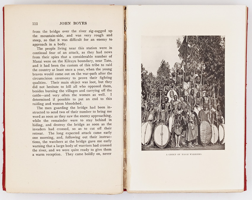 Czech (Dr. Kenneth P.) An Annotated Bibliography of African Big Game Hunting Books 1785-1999 (Second enlarged edition, Trophy Room Press, 2011), page 33, describes this as the American edition of John Boyes’ King of the Wa-Kikuyu, published in London in 1911. ‘This is an excellent African adventure story but with only a few pages of hunting for rhinoceros, leopard and lion in British East Africa. Boyes became the virtual leader of the Kikuyu tribe and relates his observations of the people and intertribal warfare.’