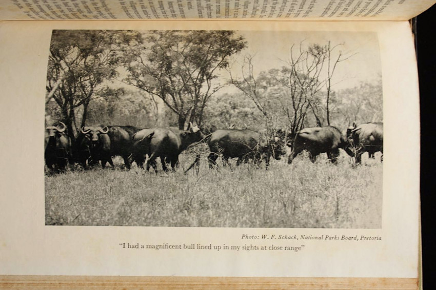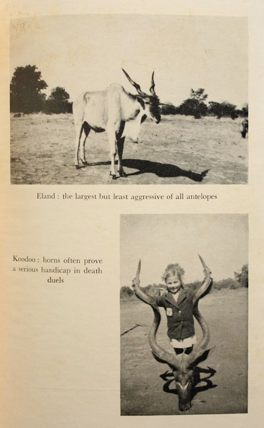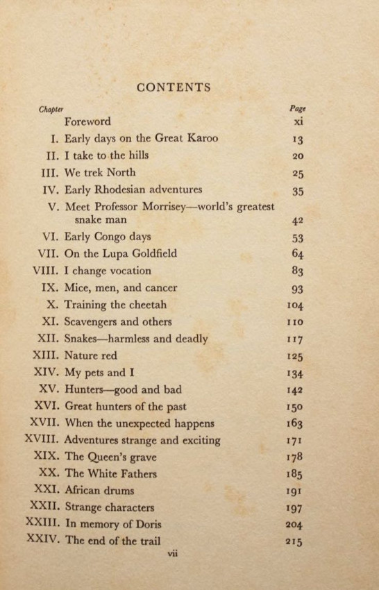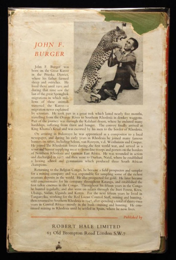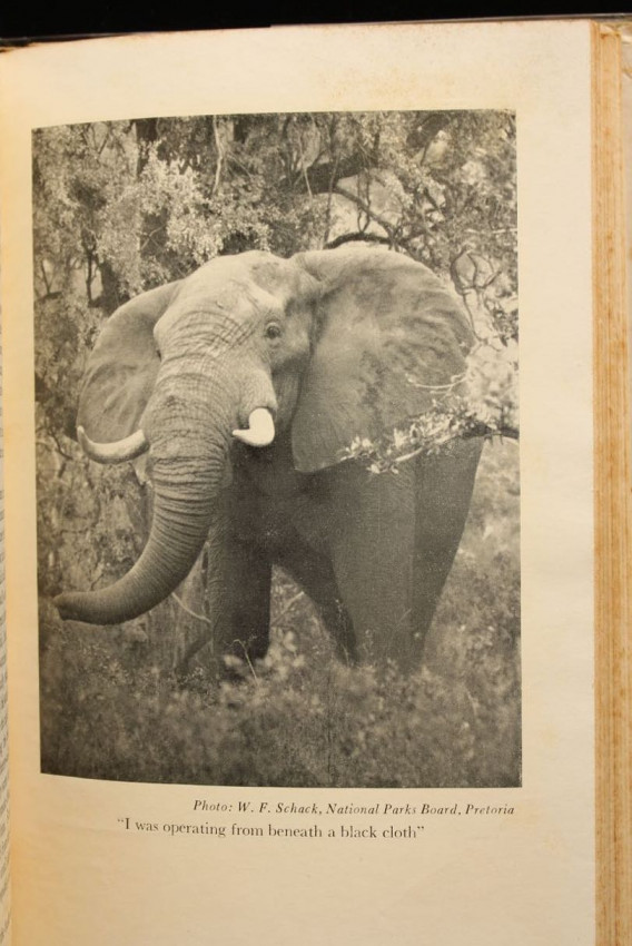 On one side road he accompanies the world's most fantastic snake man and sees him capture and take bites from the deadly mamba and cobra. In the dense forest of the cannibal he sits at night and listens to the savage drummers sending out their messages - and interprets them successfully. On Christmas Eve he sits around the campfire in the vast open plains and sings Christmas carols with the blacks, whilst the music is provided by a celebrated artist. On yet another night he sits and listens to intimate stories about the most famous hunters who have passed over the African hunting scene. And, once again, the reader shares adventures on the trail of the lion, the elephant and buffalo.' - editor's note
