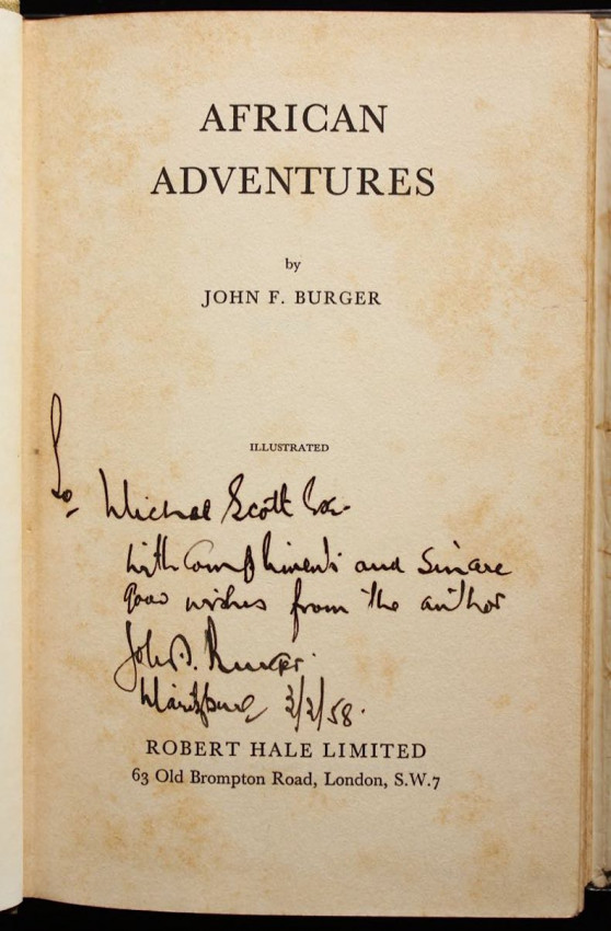INSCRIBED by the author on the title page: "To Michael Scott Esq., with compliments and sincere good wishes from the author John F. Burger, Maritzburg, 3/2/58."