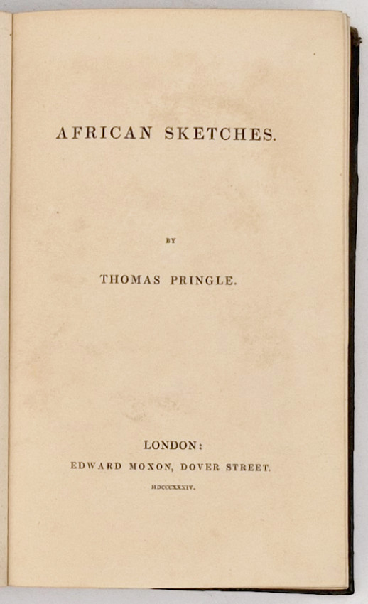 Mendelssohn (Sydney) South African Bibliography, volume 2, page 187, 'This volume reproduces the South African poems published in "Ephemerides," and others which appeared in various periodicals to which the author was an occasional contributor. The "Narrative of a Residence in Africa" is published for the first time, having been delayed owing to Mr Pringle's duties as "Secretary to the Society for the Abolition of Slavery throughout the British Dominions."'