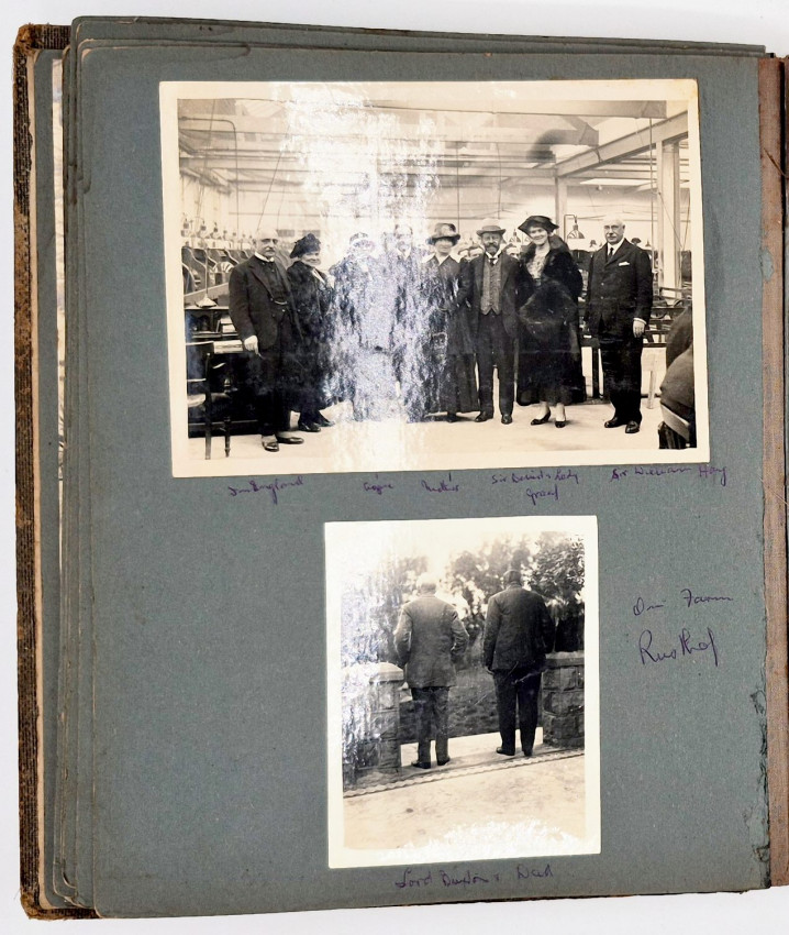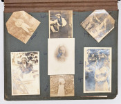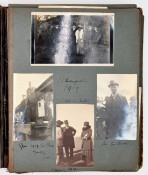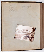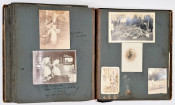 Album with a black leather back and grey cloth sides containing 30 stiff card leaves with approximately one hundred photographs laid down, the photographs vary in size. Many are captioned in ink by Annie or by 'Dad' (the couple had five children, three sons and two daughters), several of the leaves are loose.