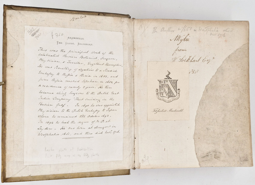 A manuscript note on the letterhead of Arandells, The Close Salisbury, is affixed to the front paste-down endpaper which gives a brief biography of Engelbert Kaempfer, also with the bookplate of Fitzherbert Macdonald on the free endpaper (part of the endpaper is torn away). Fitzherbert Macdonald was the owner of Arundells in the nineteenth century and of the British prime minister Sir Edward Heath from 1985 to his death in 2005.