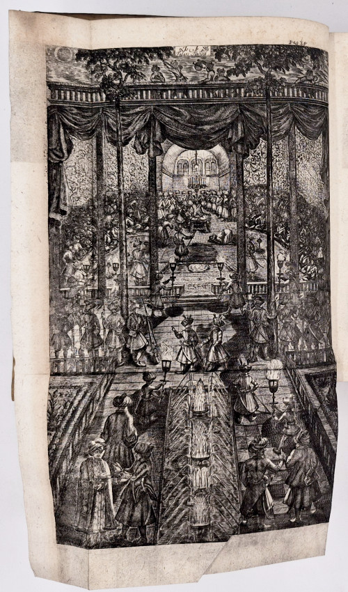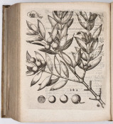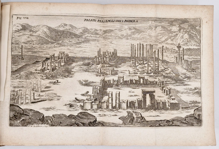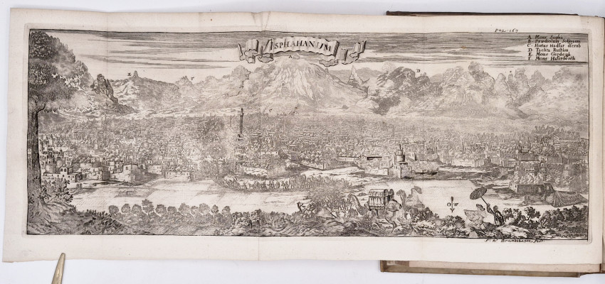 First Edition: (xviii), (ii), 3-912, (xxxii (index) pages, engraved frontispiece, title printed in red and black, 16 engraved folding plates including the large panorama of Isphahanum and a folding chart, 74 full and half page engraved and woodcut plates many of botanical subjects, contemporary full vellum (back darkened) title hand lettered on the spine, a very good copy.