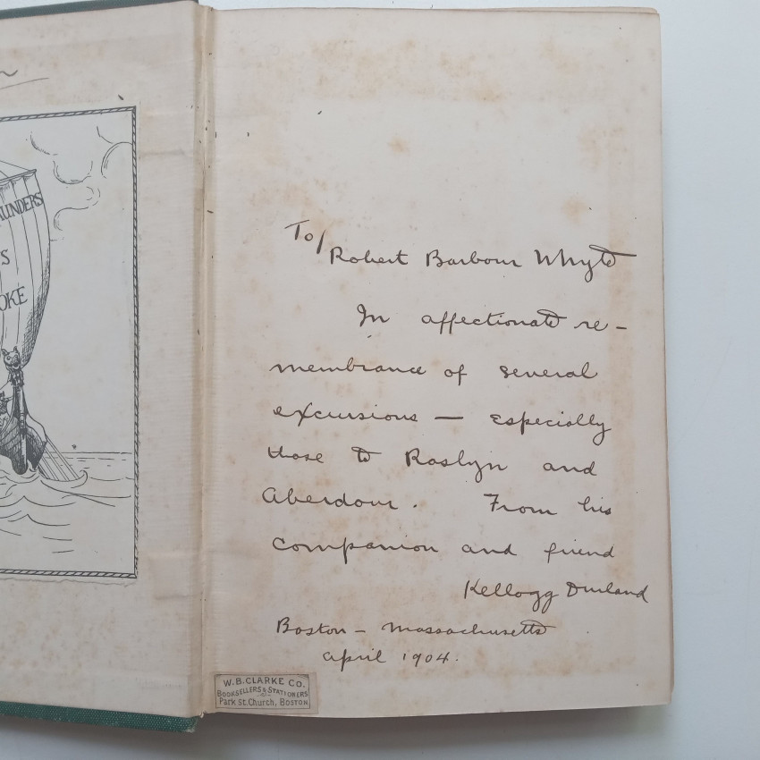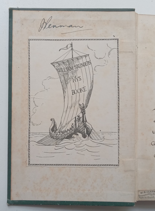 Condition: Good. Light rubbing and spots of edgewear to boards, light wrinkling where sections of cloth covering on boards is coming loose. Light shelfwear to top and tail of spine. Previous owner’s signature and bookplate on front pastedown, previous seller’s slip on front endpaper. Some foxing to endpapers and pastedowns, offsetting from inscription on title page. Light splitting to gutters between a few pages. Text clean. Overall still well bound.