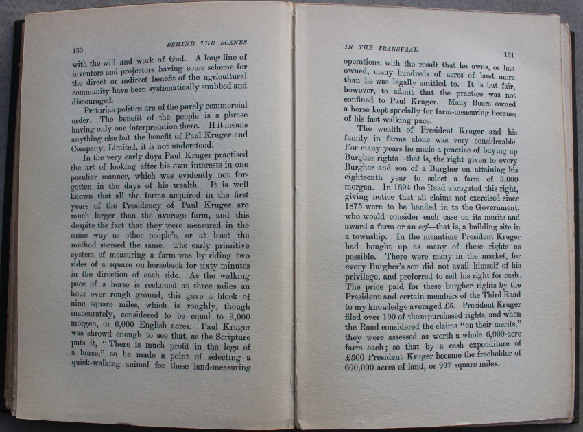 An intriguing book exploring, in nineteen chapters, the psychology of the Transvaal Boer, and 'Colonial ignorance of the Transvaal in its early days'. Many chapters dealing with the early mining claims on the Rand reefs; as well as notes on the 1884 convention, diggings in the Cape (De Kaap goldfields) and Transvaal. Notes and observations on Kruger himself and many of the gold and diamond mining activities in Cape and Transvaal. (Mendelssohn volume 2 page 624)