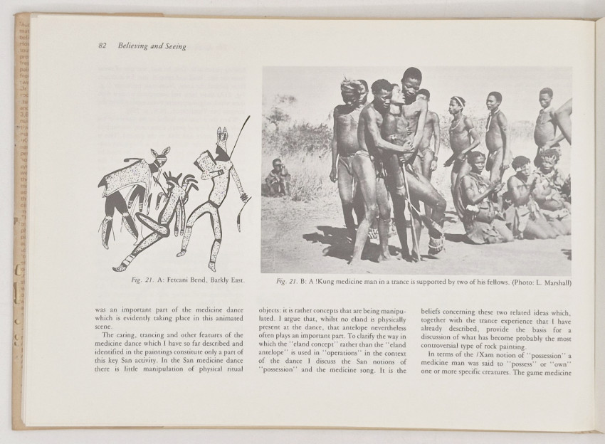 'Dr Lewis-Williams began his work with the San rock paintings in 1959. He has made a special study of every example in the Giant's Castle and Barkly East areas of southern Africa, some 3,600 in all, and has submitted his inventory to numerical analysis. He has combined an exhaustive study of published and unpublished material with his own field work amongst the !Kung of Botswana and South West Africa. This has enabled him to identify important and persistent values and beliefs and to show how these have been translated into the graphic symbols of the art. He suggests that the paintings were neither mere exercises in primitive aesthetics nor purely evocations of sympathetic magic for the control of hunting. Rather, they are associated with the whole fabric of ritual and the activities of the medicine men who exorcised sickness, made rain and controlled the movements of game.' Editor's note.