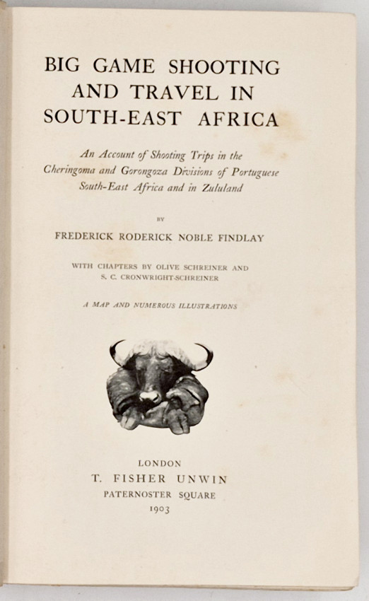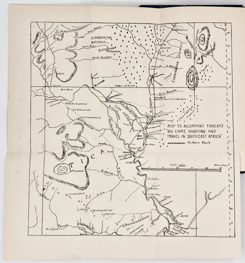 Czech (Dr. Kenneth) An Annotated Bibliography of African Big Game Hunting Books 1785 – 1999, page 95 -96: 'Findlay trekked through the virtually unknown recesses of the vast swamp and forest lands of Portuguese Southeast Africa and along the Urema and Massarara rivers. The game encountered included buffalo, waterbuck, hartebeest, lion, leopard, reedbuck, and other game. He then travelled to Zululand and bagged black rhino, buffalo, kudu, hippo, and inyala near the Manzibomvu River. Findlay also describes a springbok and ostrich hunt in the karoo country of Cape Colony. Though an ardent sportsman, he also realized the limits of wild game in Africa and argues for the preservation of habitat and maintaining healthy numbers of game animals.'