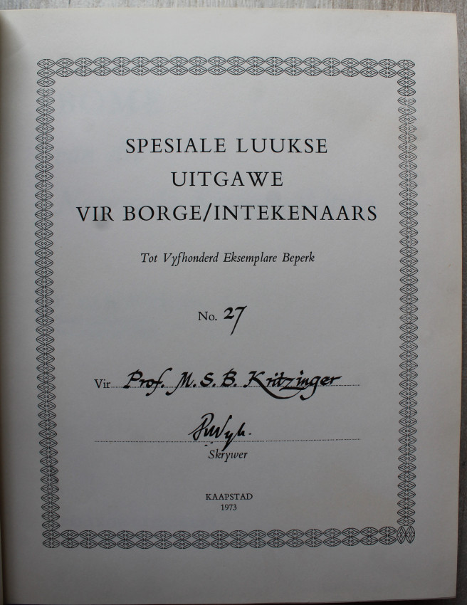 Spesiale Luukse Uitgawe beperk tot 500 eksemplare. Hierdie een is genommer 27 and Prof. Kritzinger. Geteken deur die skrywer.