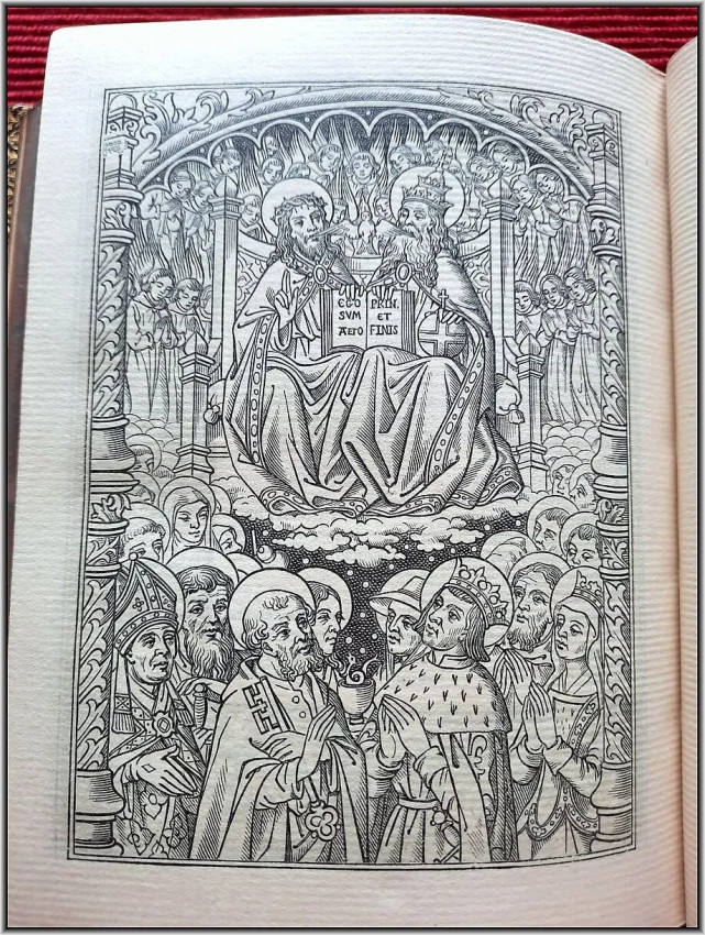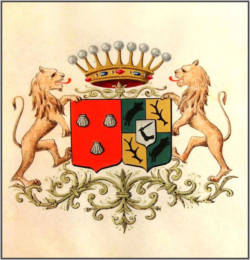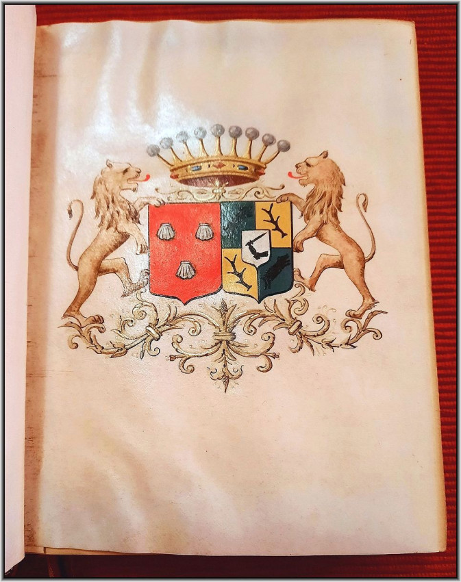 NOBLE PROVENANCE - With an additional vellum front free endpaper with two Coat of Arms in Color & Gilt (the one from the left is from the noble French house of Philippe de POMPERY (Pompery Pompry Champagne Bretagne); another Coat of Arm from the right is unknown to us). Two Coats of Arms on vellum are surrounded by: Royal Crown on the top, two Golden Lyons to the each side; and gilt fleurons at the bottom.