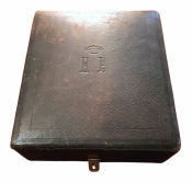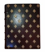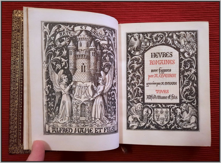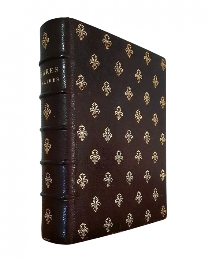 "Heures Romaines"; Tours, Alfred Mame et Fils, 1885; Size of the book: 15,8 x 12,5 cm; Size of the wooden box: 20 x 17,5 x 5,8 cm; Brown Morocco leather binding. Binding embossed by gilt Fleur-de-Lys symbols. Spine with five raided bands. Gilt title to the spine. All page edges gilt; Text in French; Collation complete - Vellum free endpaper with gilt & color Coats of Arms, [6], False title, Frontispiece, Engraved title page, [20], 516 pages, [8]; Full Morocco leather binding is tight and firm, overall in pristine condition, with insignificant wears/traces of use. Pages/Text block in also immaculate condition, clean and bright, no foxing or marks throughout. Overall the condition of the book is NEAR FINE. Wooden box is in very good condition, with some traces of use to the exterior, but whole, strong and stabile; interior is in excellent condition.