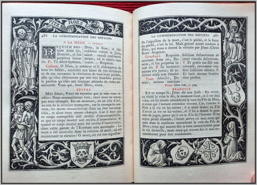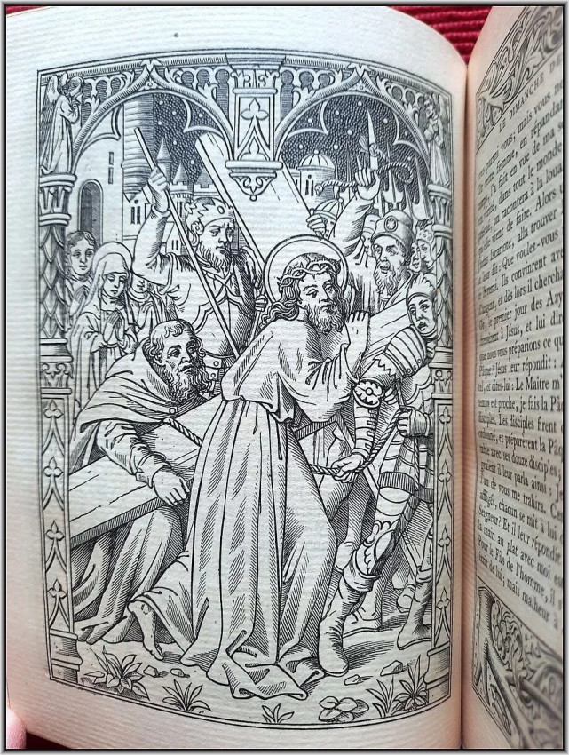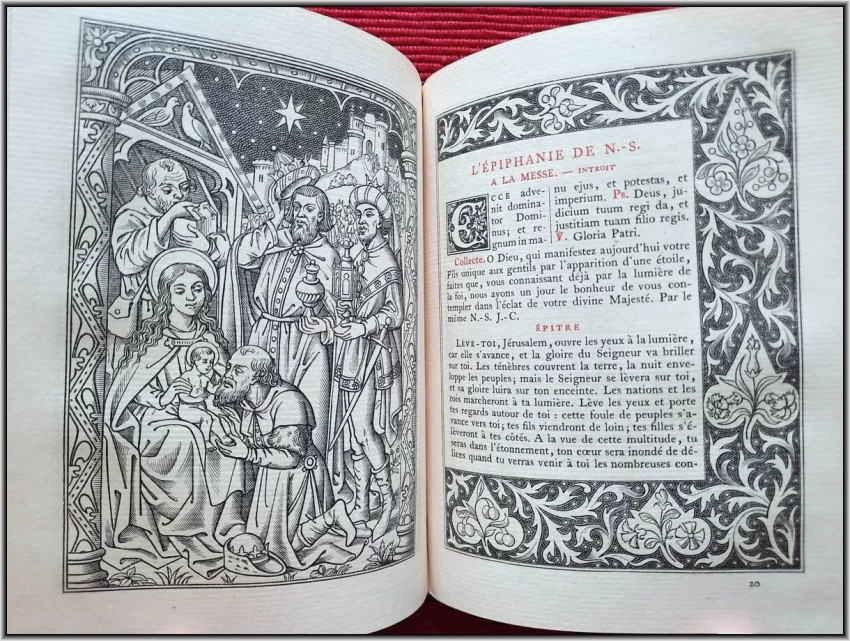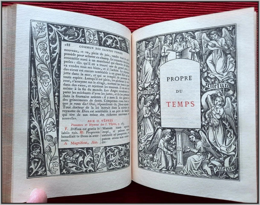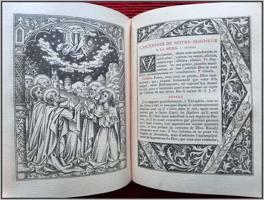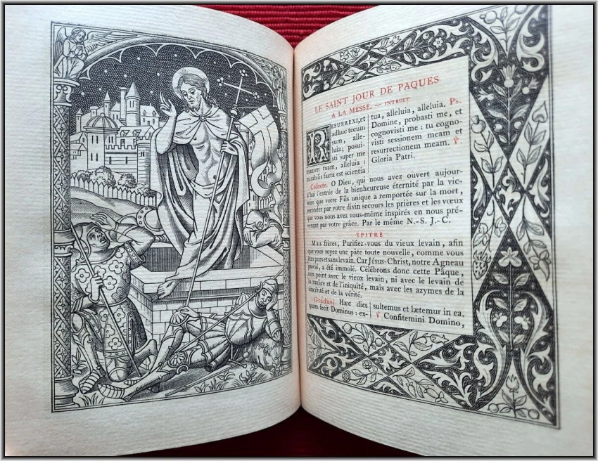 We are offering here a scarce Roman Catholic "Book of Hours" from 1885 with Frontispiece, Engraved title page, 25 engraved plates and 5 engraved chapter titles, plus an additional vellum front free endpaper with two Coat of Arms in Color & Gilt. All 516 pages richly illuminated and illustrated by famous French engravers A. Queyroy and A. Gusman. Pages/text block from high quality woven paper.