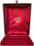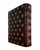 Bound in an unique brown Morocco leather binding with Fleur-de-Lys Symbols embossed in gilt to the boards and spine. Binding signed to the spine by Lesort. Very rich decorated front and rear paste-down with gilt frames and bordeaux Moirée silk. Free endpapers also accompanied by bordeaux Moirée silk. Stylised gilt monogram initials "H.P(ompery)" and gilt crown to the front paste-down. Sold together with an original custom-made wooden box with metal lock mechanism and red satin interior. Wooden box signed inside the box cover by famous French printing and publishing house Lesort. Monogram Initials "H.P(ompery)" with Royal Crown embossed to the box cover.