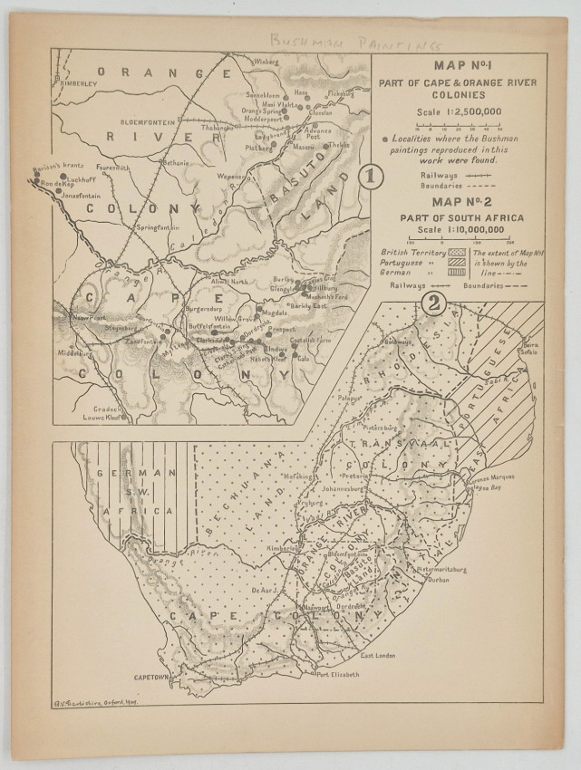 First edition: 48 page booklet bound with maroon paper wrappers - paperback containing 2 chromocollotypes - 1 double page and 6 black and white plates, preface, introduction, notes on the Bushmen and list of plates with 1 loose sheet with 2 maps, 54 loose colour plates of Bushman paintings, housed in the original maroon paper covered solander box which is worn with the lid detached. The contents are in a very good condition.